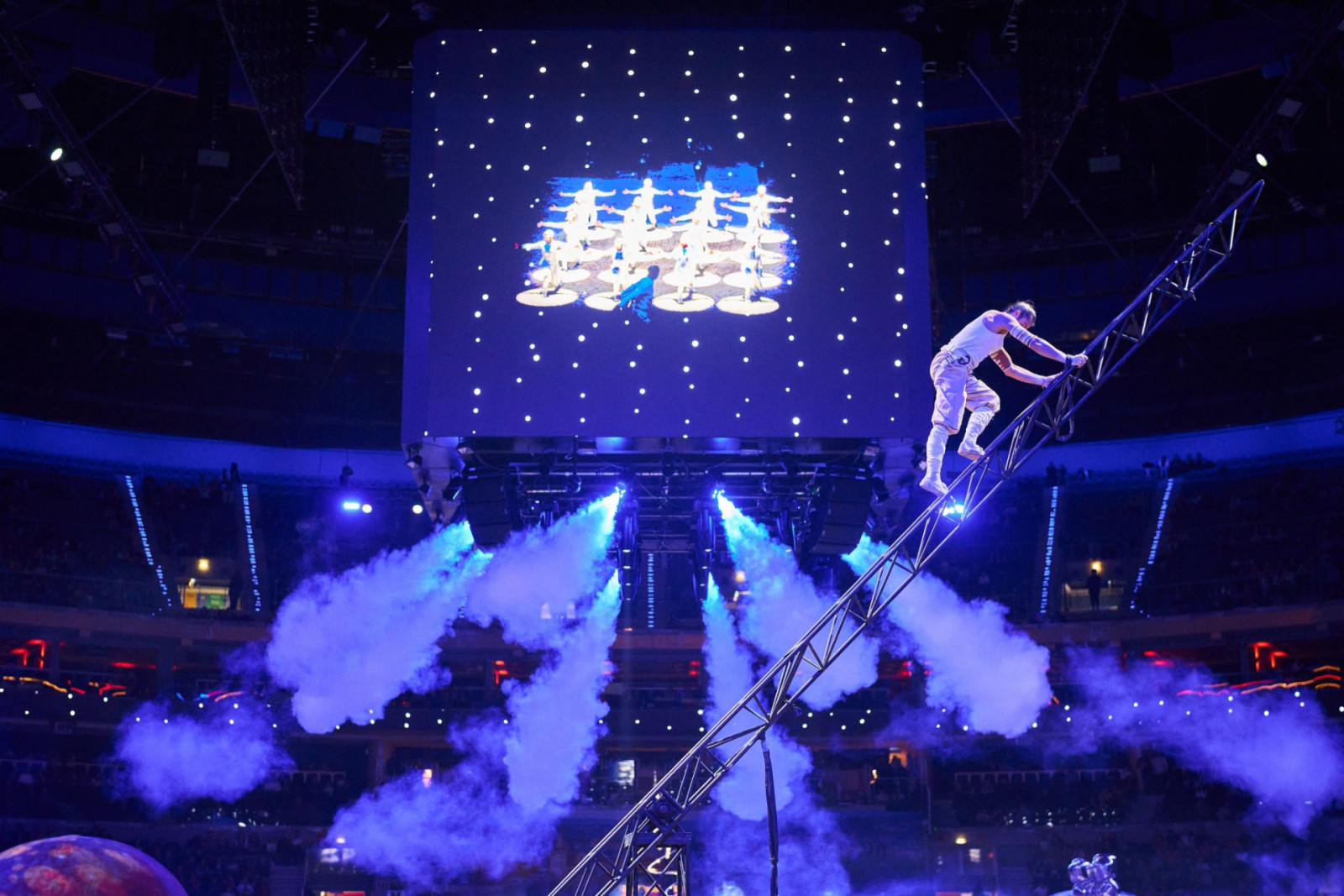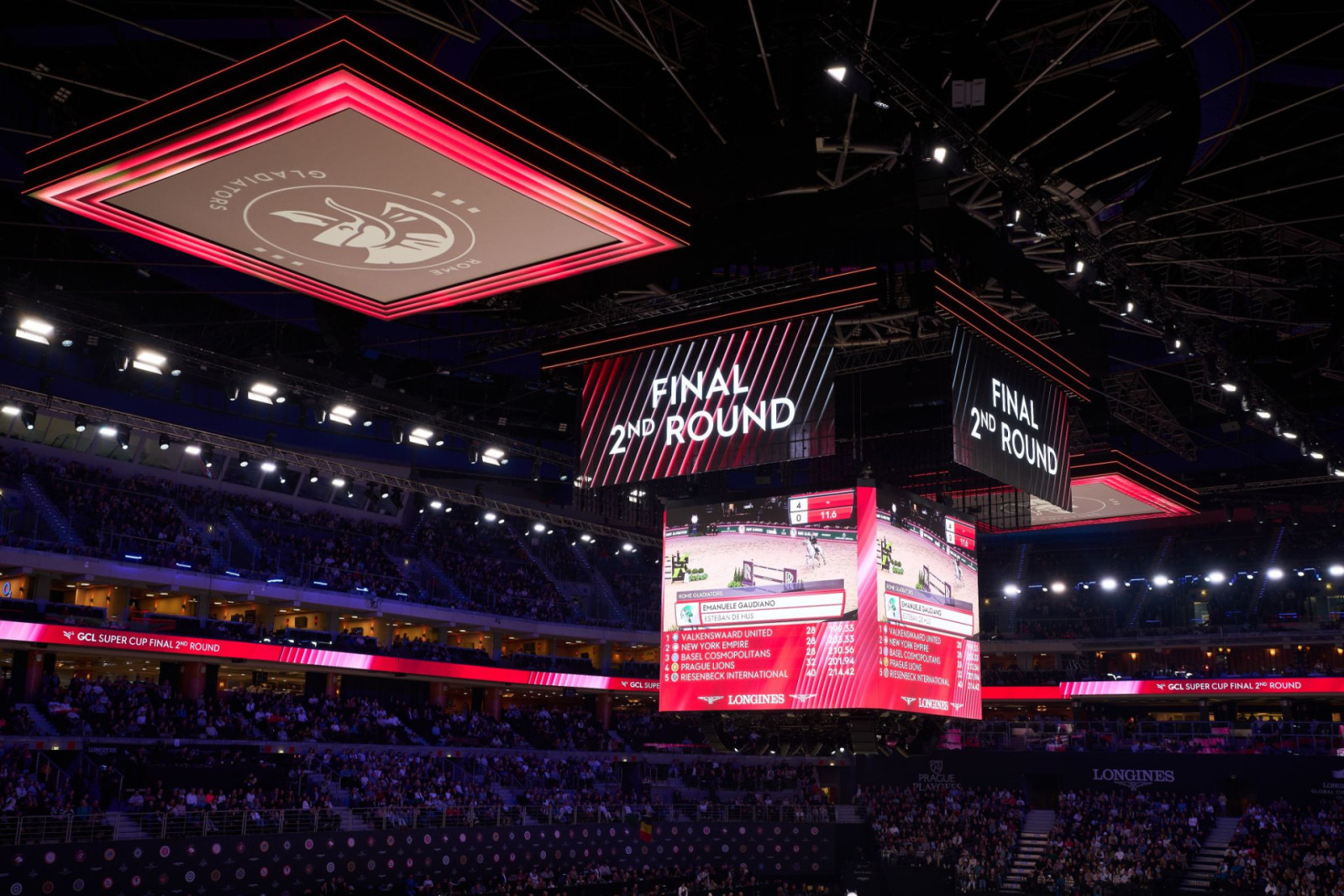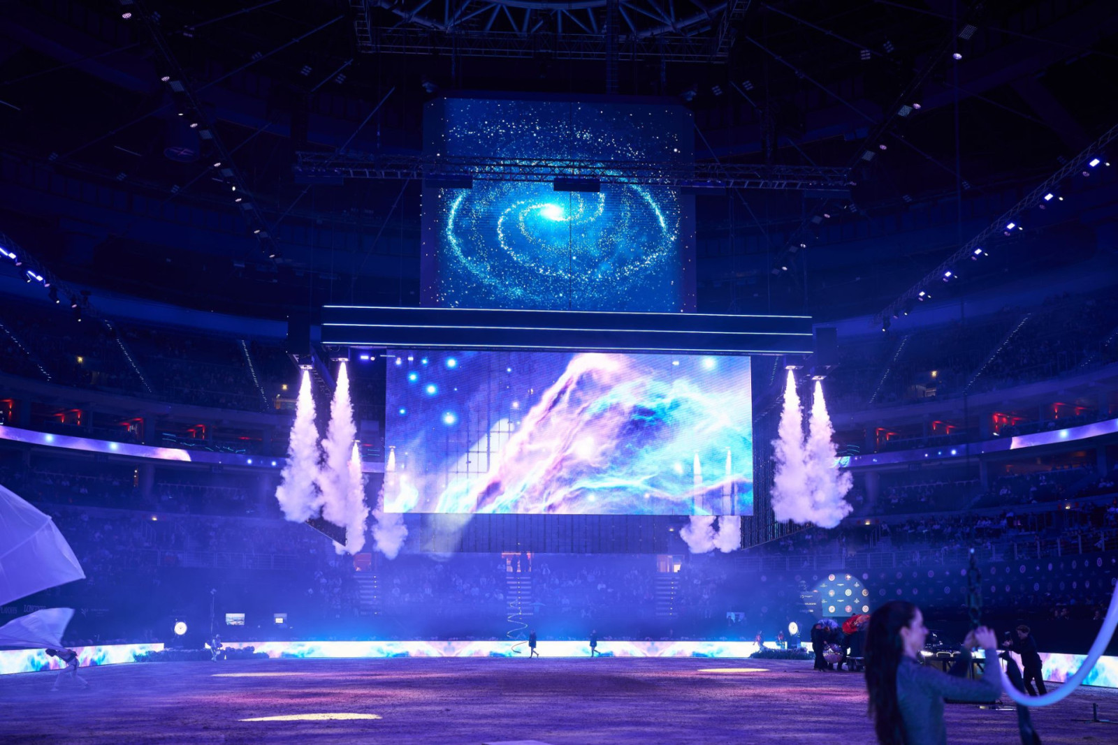 The installation included an LED gate for the athletes’ entrance, an expansion of the central LED cube with four transparent LED displays (each 9×4 m), and two 10×10 m LED frames suspended from the ceiling, fitted with special fabric for GOBO projections. During the event, on-site operation and full installation were handled by a dedicated technical team.