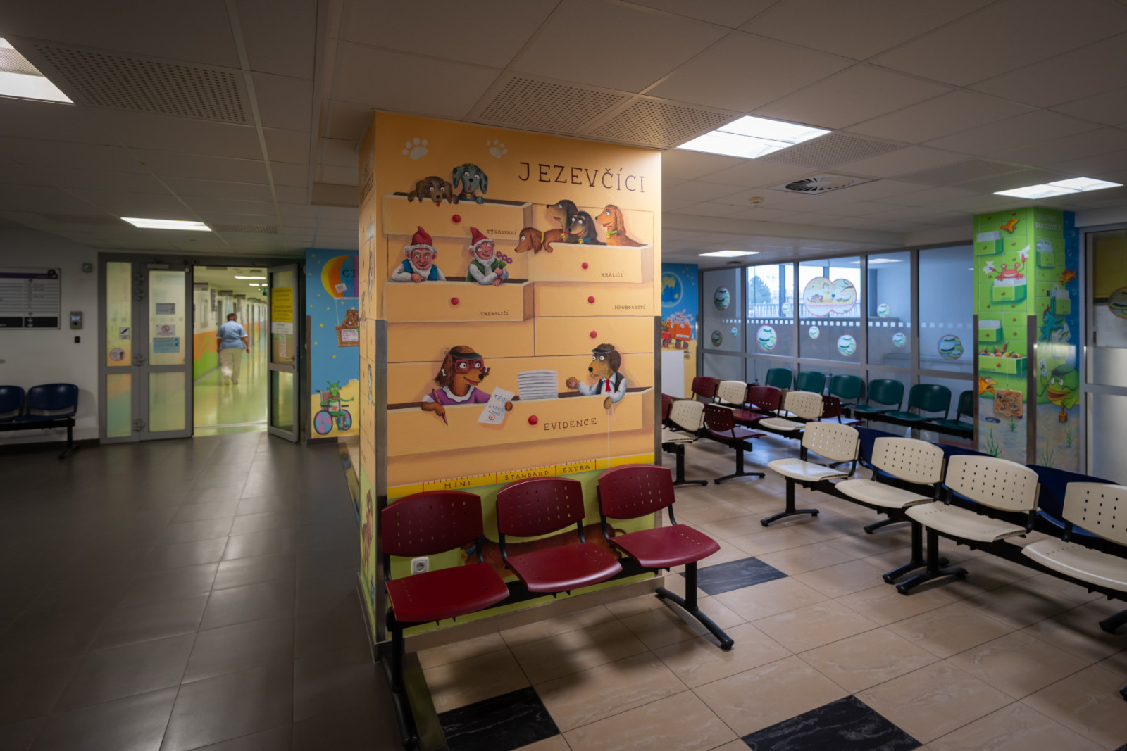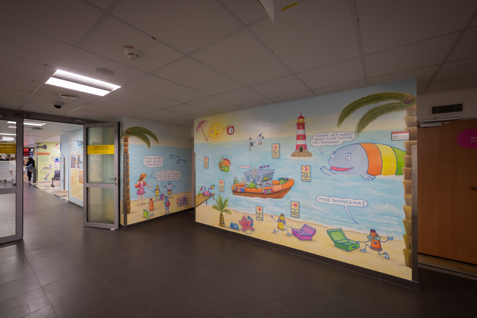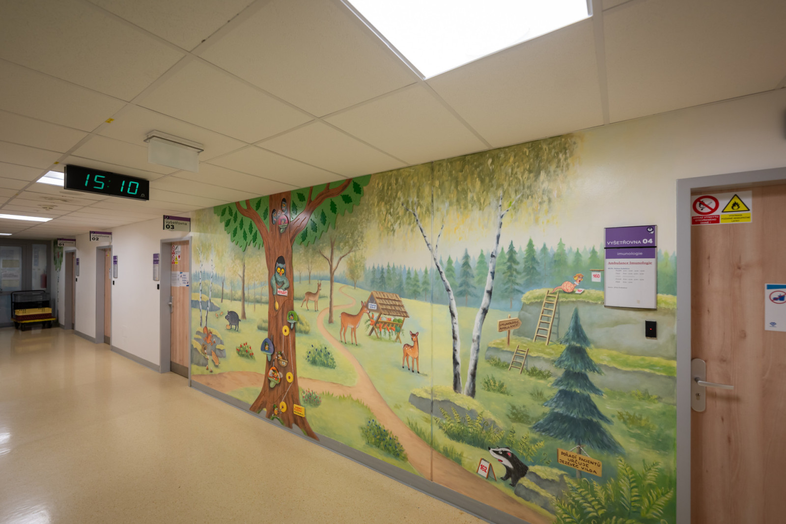 Výtvarnice Bára Milfaitová vytvořila působivou nástěnnou malbu, která dětem jednoduše a srozumitelně vysvětluje principy imunitního systému. Ambulance připomínají procházku veselým lesem doplněnou plastickými prvky. Prostor tak působí přívětivě a zároveň vzdělává.