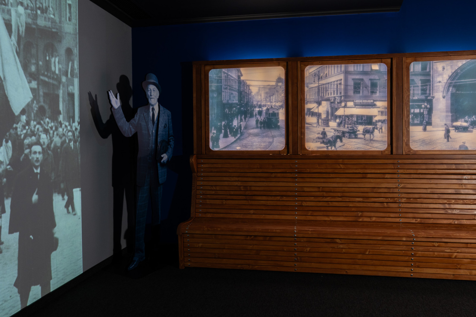 Pro kontrast s pracovnou vzniká také scéna „ulice“. Rašínovy ideje bylo nutné zasadit do širšího rámce – do života obyčejných lidí. Proto jsme vytvořili iluzi rušné pražské ulice. Chtěli jsme, aby návštěvník slyšel hlasy postav, vnímal jejich rozhovory a pocítil napětí doby.