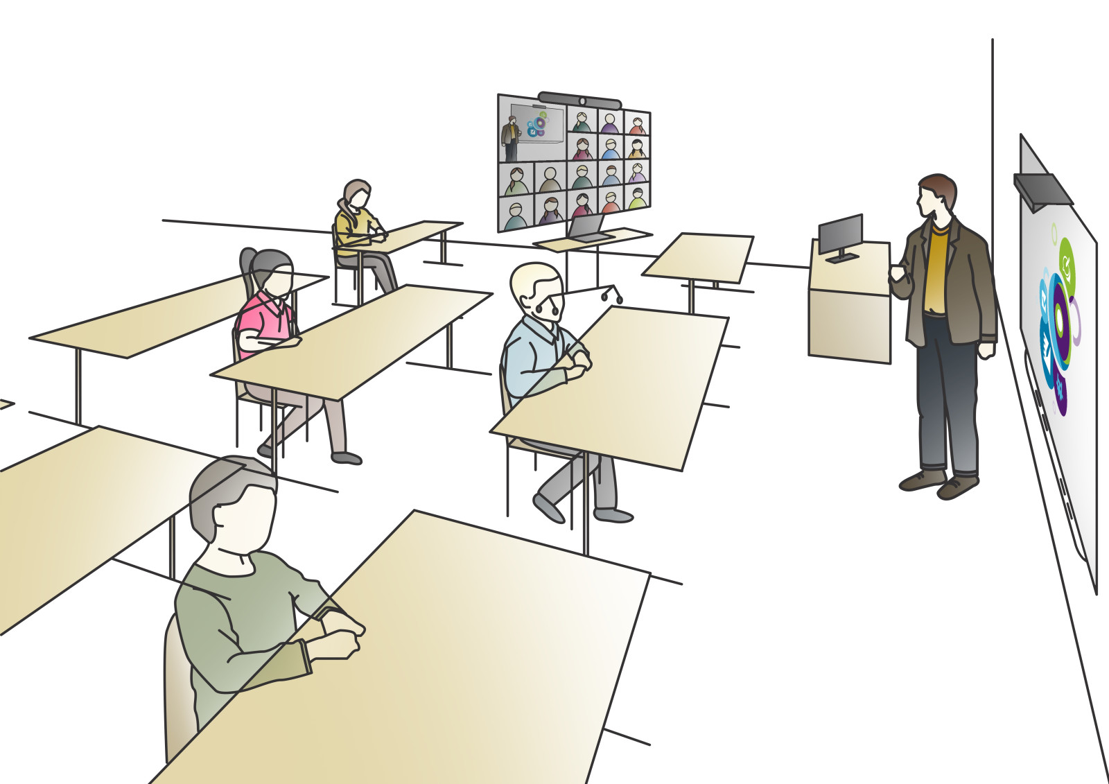 Mobilní stojan, na kterém je připevněn neinteraktivní zobrazovač o velikosti alespoň 65'' pro zobrazení tváří žáků, kteří se výuky účastní z domova. Součástí řešení je soundbar s prostorovým mikrofonem a kamerou umožňující zoom a motorický pohyb objektivu. Kamera snímá učitele před katedrou. Lze ji přednastavit do několika pohledů tak, aby uměla snímat učitele nebo plochu keramické tabule, případně rozhodnutím učitele zabere část třídy s žáky. Variabilita kamery je využitelná při různých formách výuky (frontální/skupinová práce a podobně). Takto navržené řešení má přípojné místo (HDMI + USB) s poličkou pro učitelský notebook/dokovací stanici.
