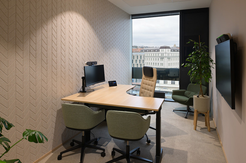 - Akustika v kreativních zónách: Přemístitelné akustické panely nebo závěsy umožňují upravit prostor podle aktuálních potřeb. Měkké povrchy podporují absorpci zvuku, snižují rušení a vytvářejí příjemné prostředí pro kreativní diskusi.