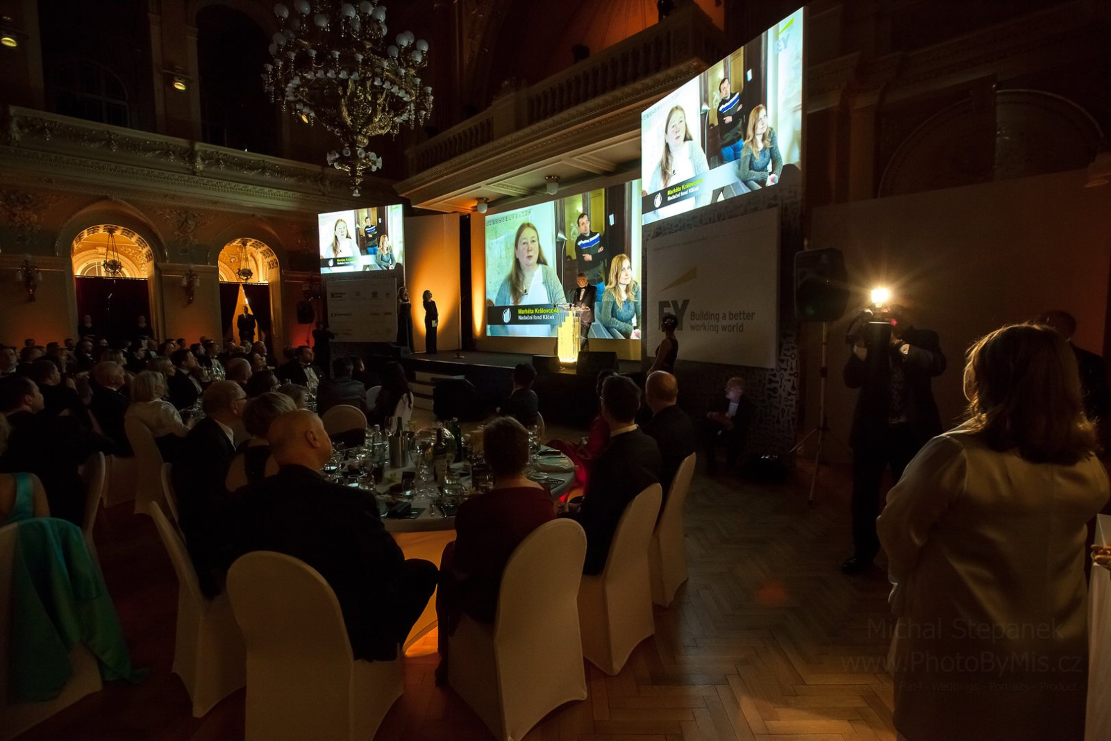 Compared to last year, when video-mapping only made up the decorative backdrop of the evening, in cooperation with the client EY, we prepared a fundamental transformation in this part this year. As the opening feature of the evening, a sound system video-mapping was implemented, which was projected on one of the side walls of the Great Hall of Žofín Palace. Upon its conclusion, the projection switched to the projection wall on the main stage, including surround sound effects. This was how the gala started. The area of the side wall of the Great Hall was used for video-mapping during the gala dinner and in the actual finale of the evening - the announcement of the main prize, when the space inside the hall and stage were lit up by a spectacular fireworks display.