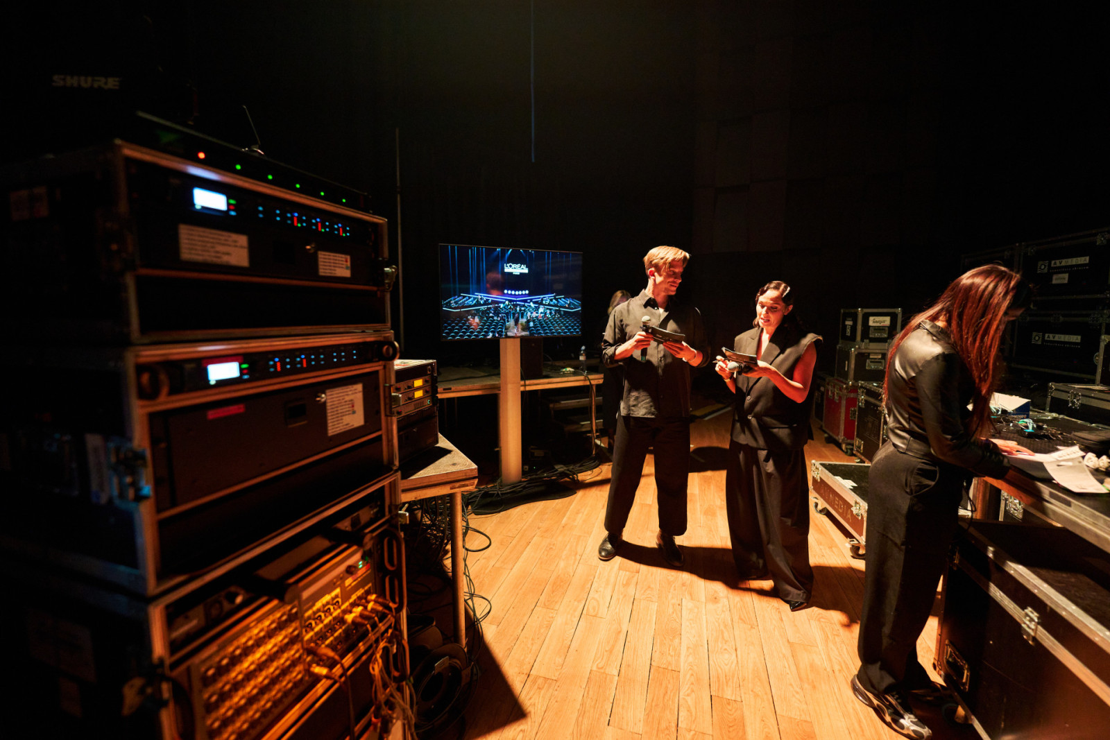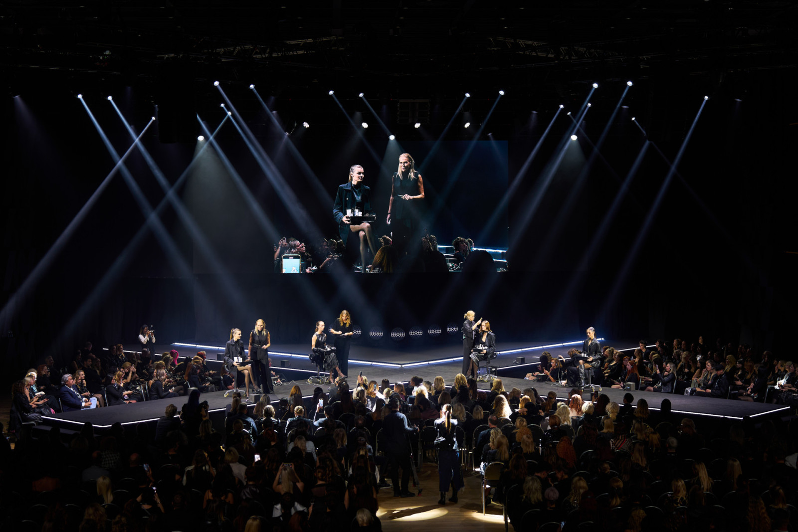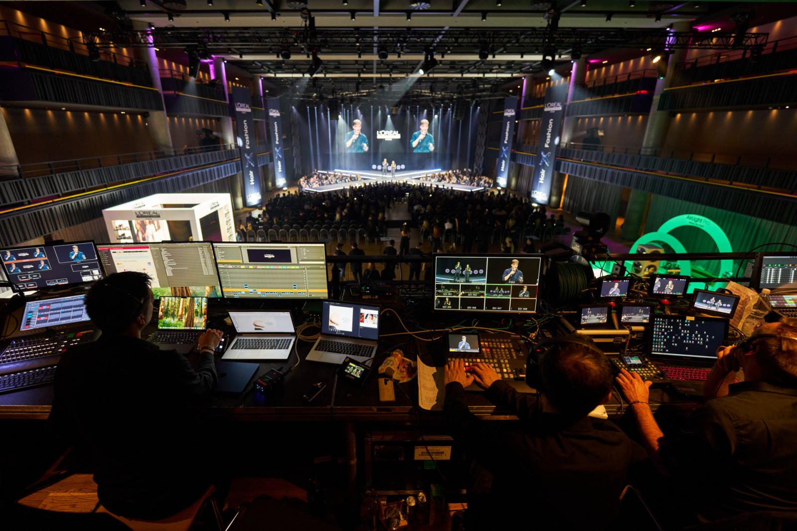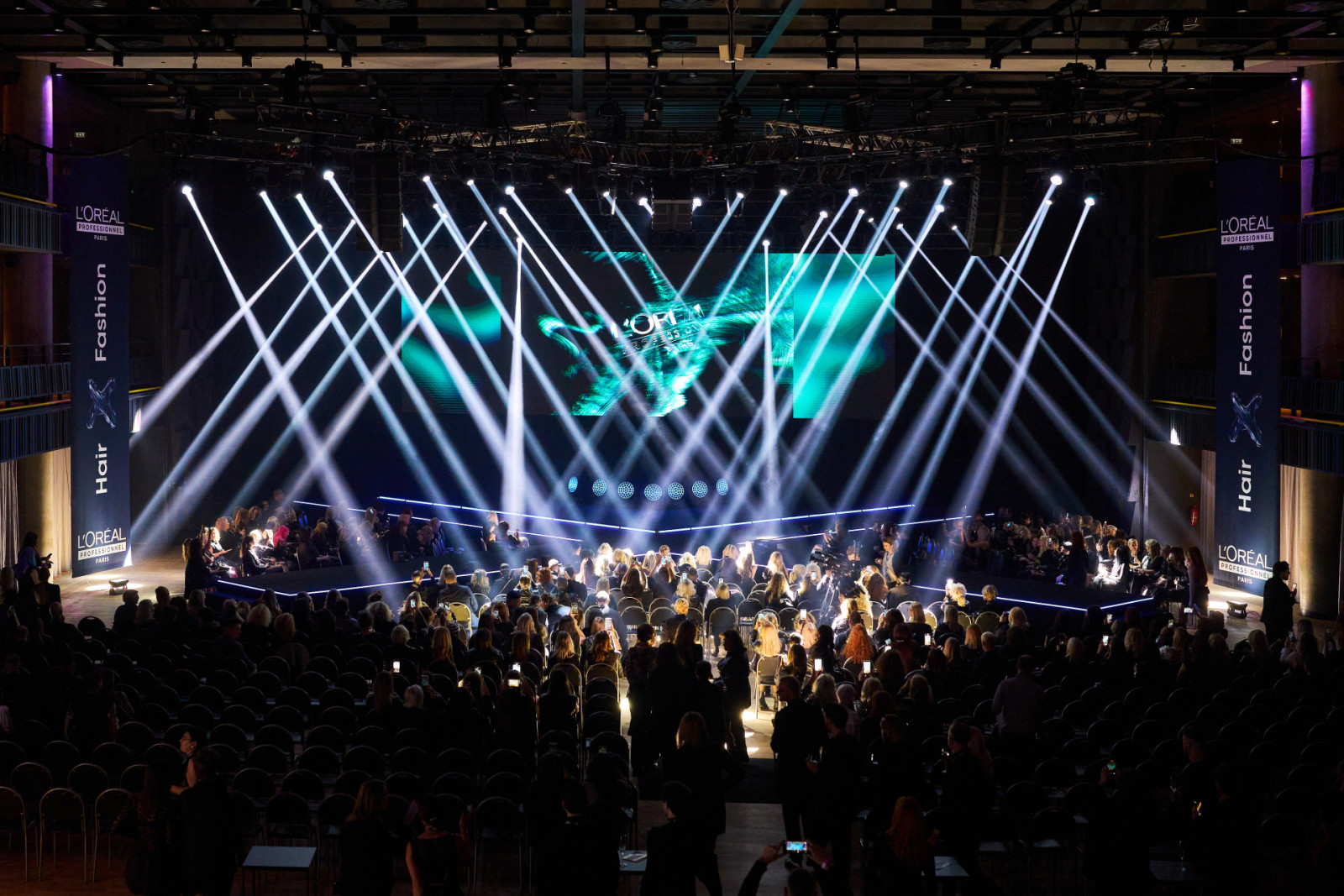 The technical setup included a custom-designed X-shaped stage, complete lighting design and operation, LED screens, video control using Barco E2 and Milumin, a 12×4 m Gloshine LED wall, a full sound system including line-array speakers and digital wireless systems, intercoms, and simultaneous interpretation provided from certified booths. The atmosphere was enhanced by more than sixty intelligent lights, battery-powered fixtures, and a striking FOGSCREEN effect that created a unique immersive entrance.