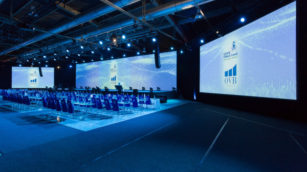 We also provided complete sound for the conference using a Nexo GEO S and NEXO STM sub-base. The G2 Pavilion at the Brno Exhibition Centre was turned into the corporate blue OVB colours using a Robe.