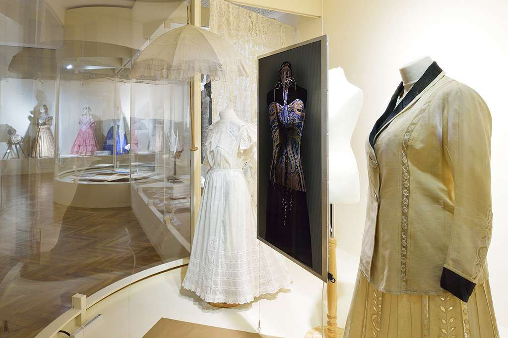 The exposition itself is located on three floors of the museum. All the exhibits, from old laces and applied needlework (dresses, handbags, hats) all the way to works of art presented at global EXPOs, as well as contemporary works, have been installed into atypical display cases along the perimeter of exhibition rooms on individual floors, with dominating soft shapes (curves) with the interior in light umber. The space, in which an important role is played by lighting on the exhibits, works highly elegantly.