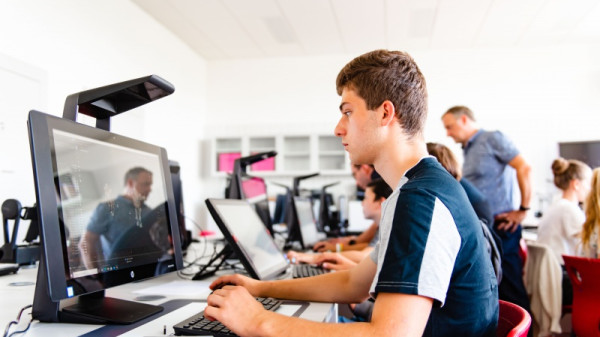 Thus, the teacher has a desk with a powerful computer, two displays, its own backup storage, a multifunction printer, a mobile visualiser that also functions as a webcam to provide remote access to the classroom, for example in hybrid learning. In addition, some classrooms are equipped with a 3D printer. For presentation, teachers then have not only an interactive whiteboard and mobile interactive display in their classrooms, but also a digital whiteboard that allows them to save all their whiteboard notes digitally or share them in real
