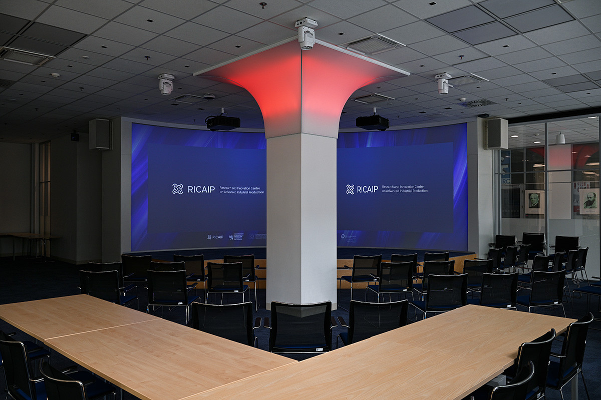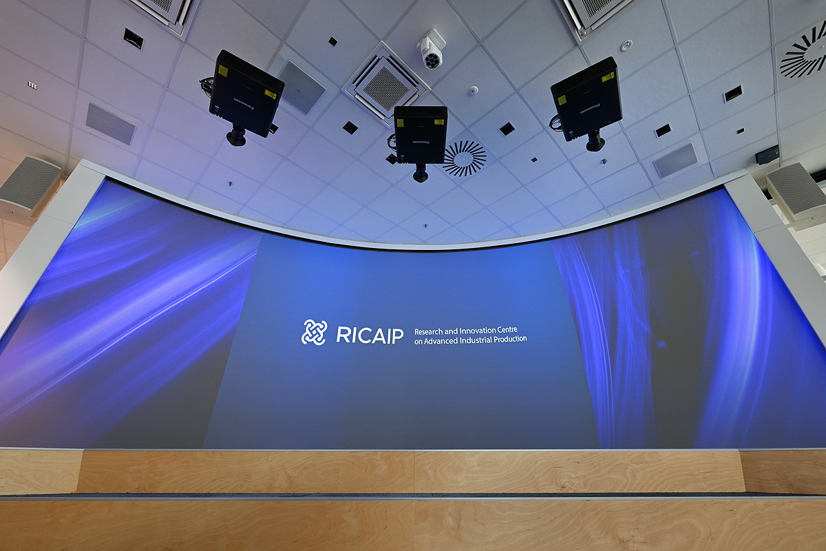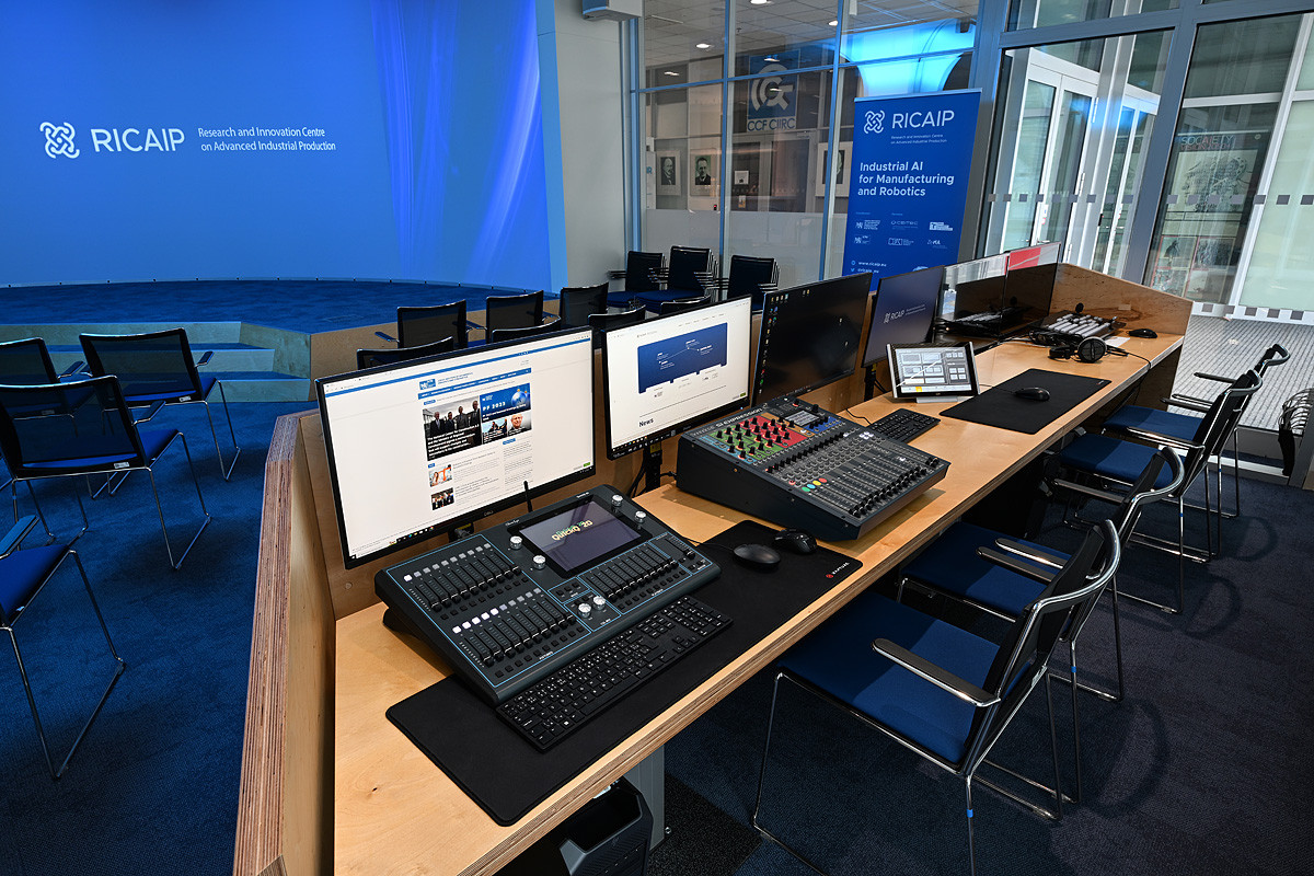 In order to connect international research teams, demonstrate innovative procedures and interactively present new technologies and their applications, the researchers came up with the idea of supplementing the otherwise purely research environment with a completely unique multimedia room. to be able to display and visually connect information from remote testbeds, as well as local machines and robotic stations, change the arrangement of the displayed audiovisual content, record it, sort it and further share it. Such an arrangement and functions can be compared to a modern control room in factories, whose operation and technology are faithfully simulated in the testbed for research and development purposes. A space was created that has versatile uses both for the modern coordination of research teams, technologies and machines, as well as for organizing educational, professional and popularization events and workshops.