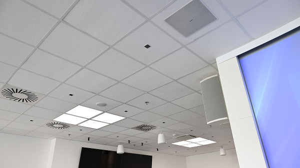In accordance with current technical trends, fully digital AV sound distribution was used in the room. Control of sound and digital lights is connected to two mixing desks located in the director's room. They make it possible, for example, to easily adjust the intensity of the lighting in the hall or to change the color of the lighting of the central column according to the current situation.