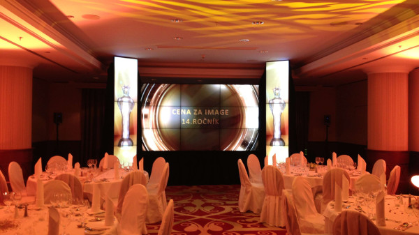 Místnost Moravia byla připravena na gala večeři a doplněná z naší strany efektní LCD stěnou a LCD sloupy pro vyhlašování výsledků v průběhu gala večeře. Nasvícení sálu bylo do zlaté barvy a hosty celá instalace inspirovala k přemýšlení nad tím, jak doladit místnost na společenská setkání.