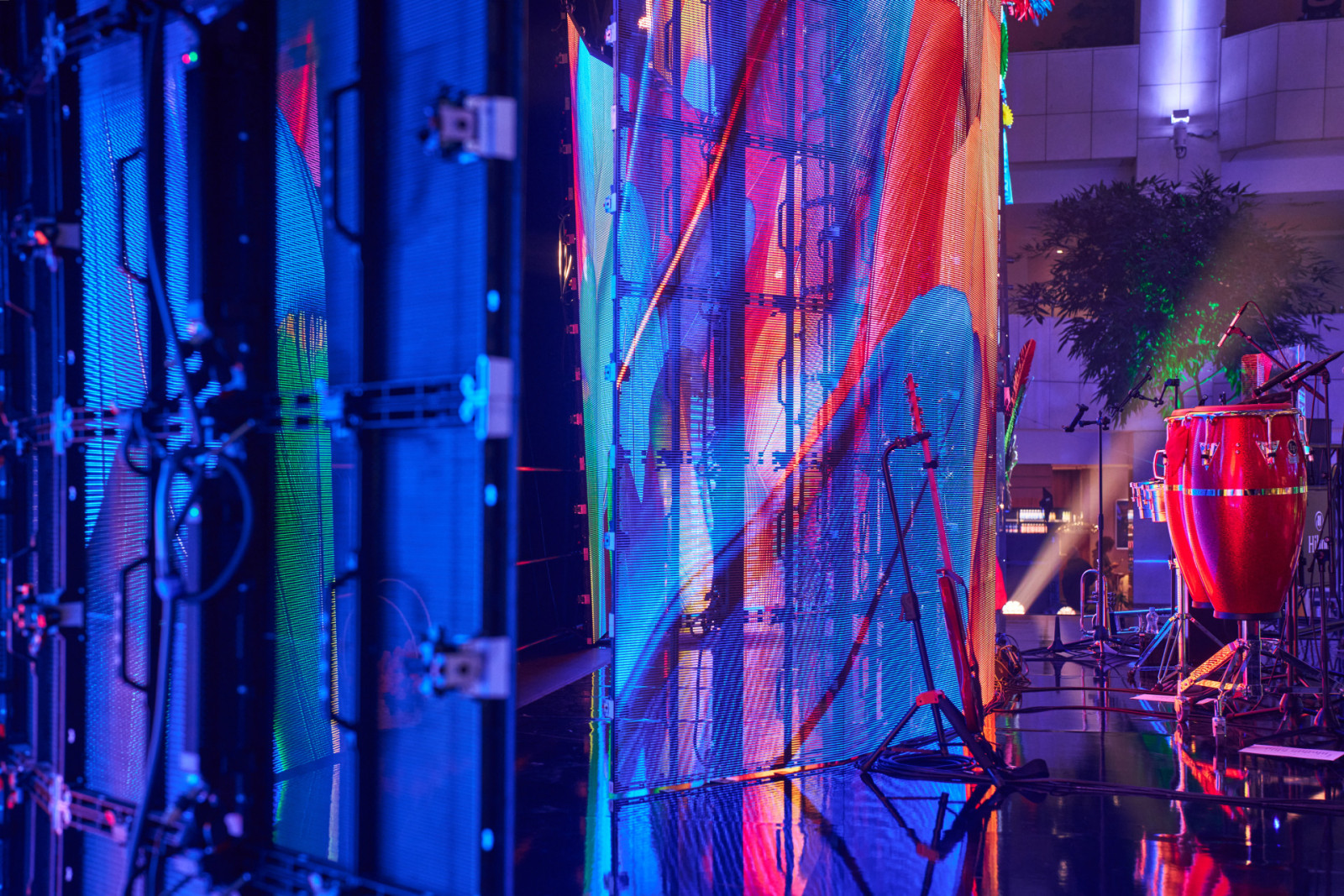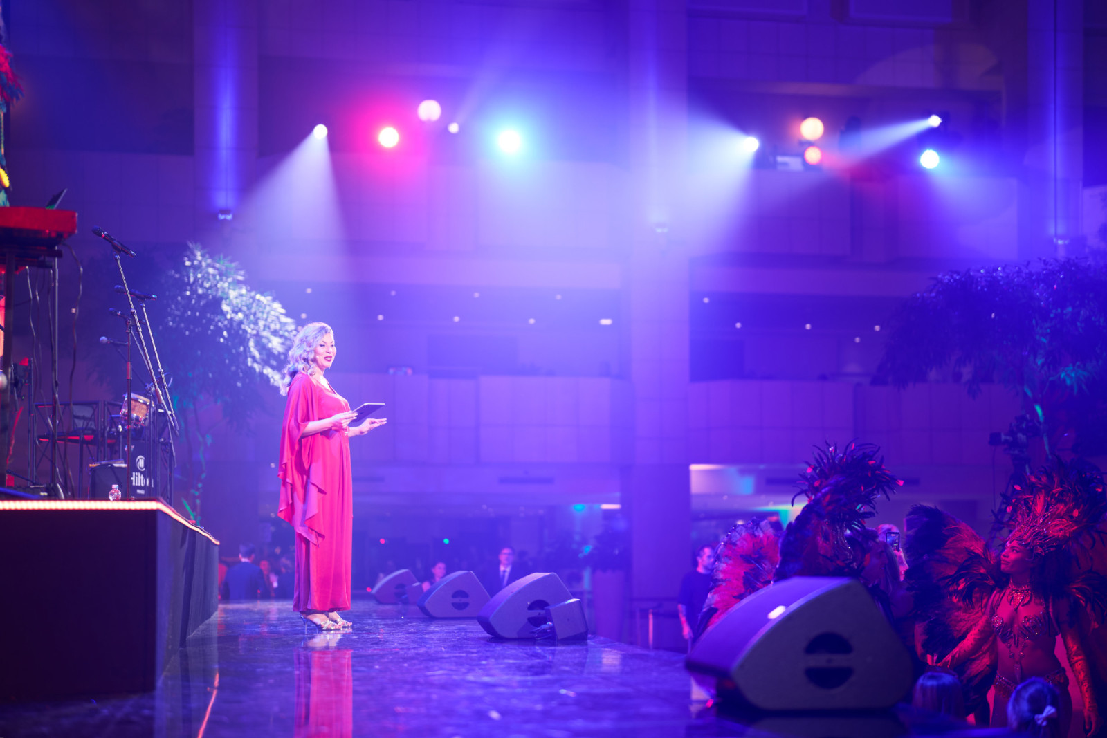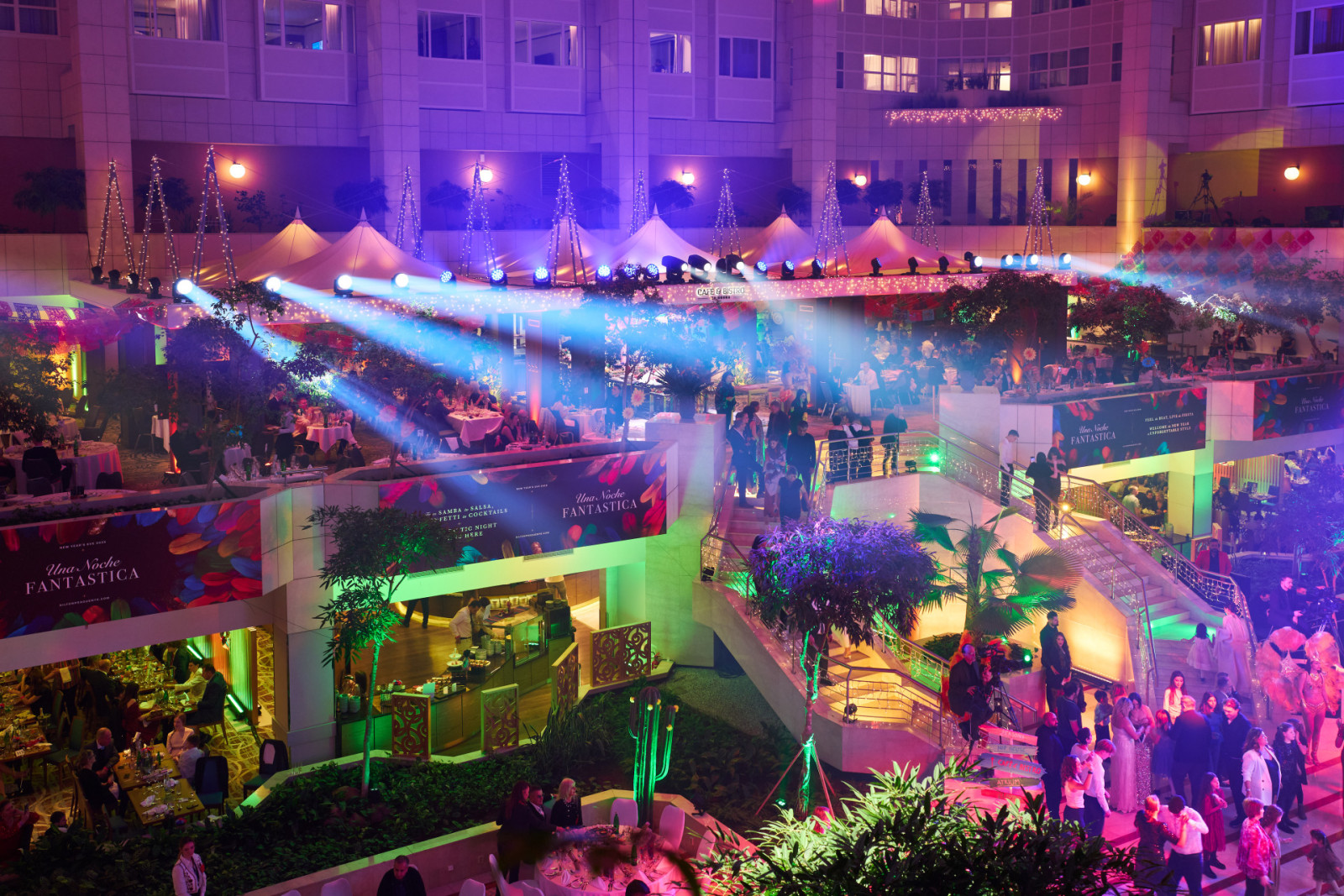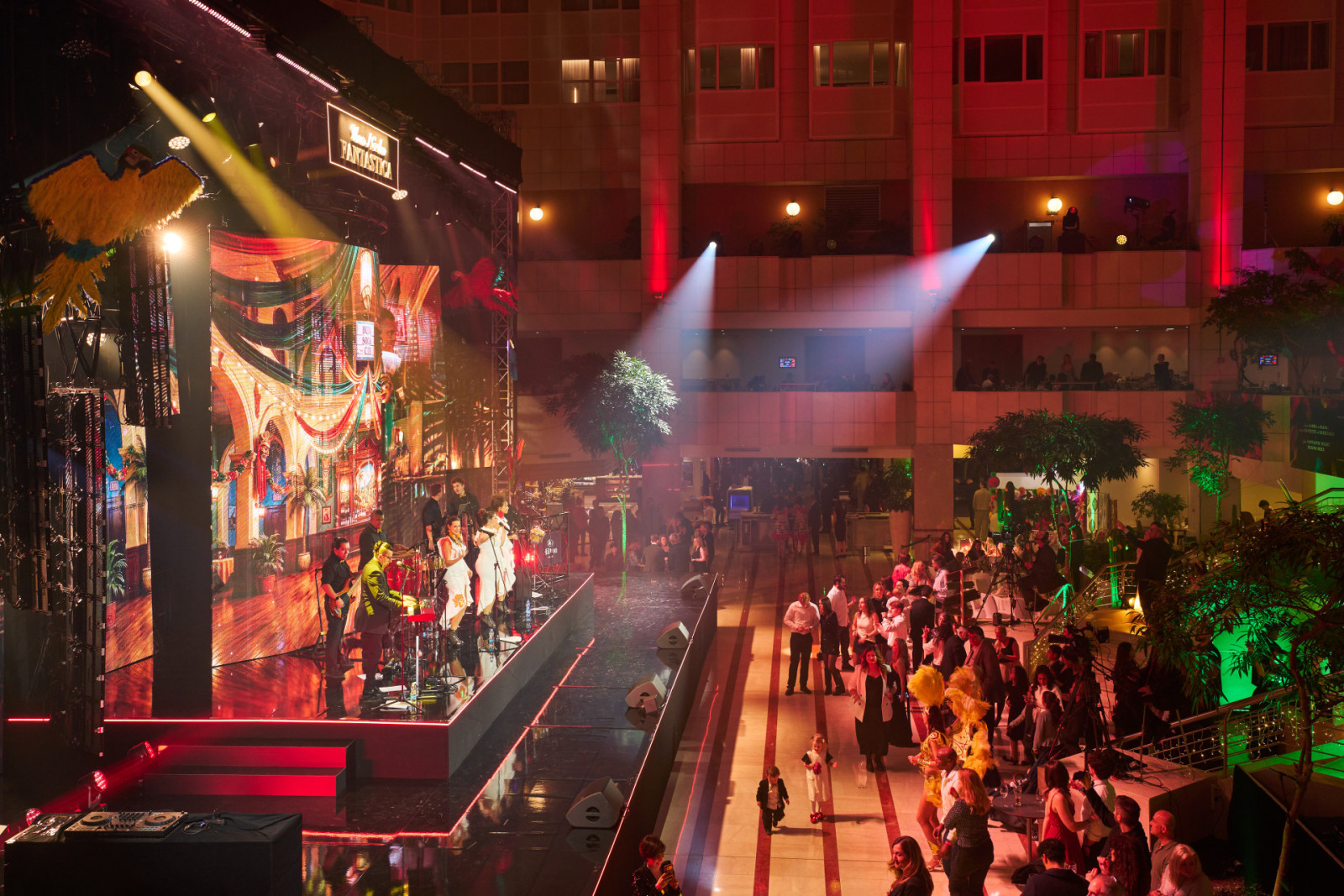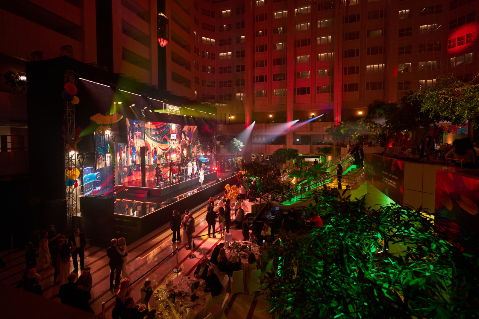 Také letos bylo zajištěno audiovizuální řešení pro silvestrovskou oslavu v prostoru Hilton Prague Atrium, která se nesla ve velkolepé a energické atmosféře. Ve spolupráci s EVENT Arena se hlavní lobby proměnilo v živý prostor inspirovaný Brazílií – plný barev, rytmu a dynamiky.