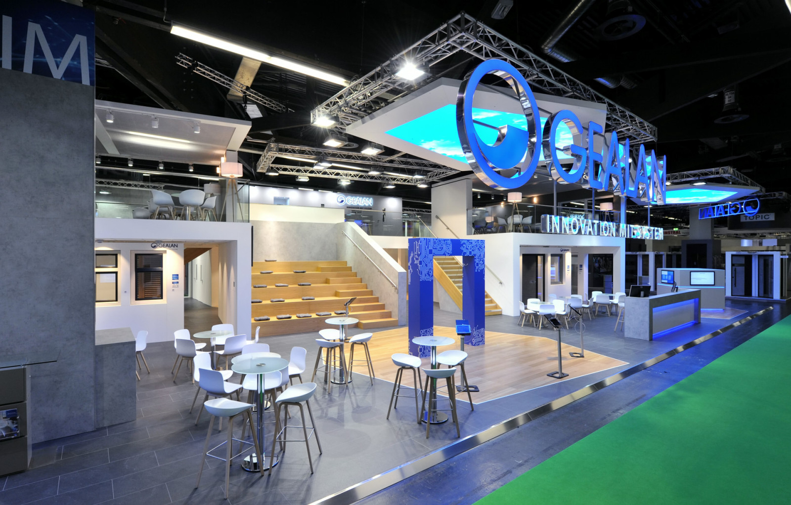 Postarali jsme se o kompletní technologické zajištění stánku – kromě téměř 50m2 LED stropu jsme na stěny stánku zavěsili 82“ LED displeje Samsung a na aluru 98“ obrazovky od stejného výrobce. Díky inovativnímu využití technologií působil stánek Gealan moderním dojmem a poutal na sebe pozornost.
